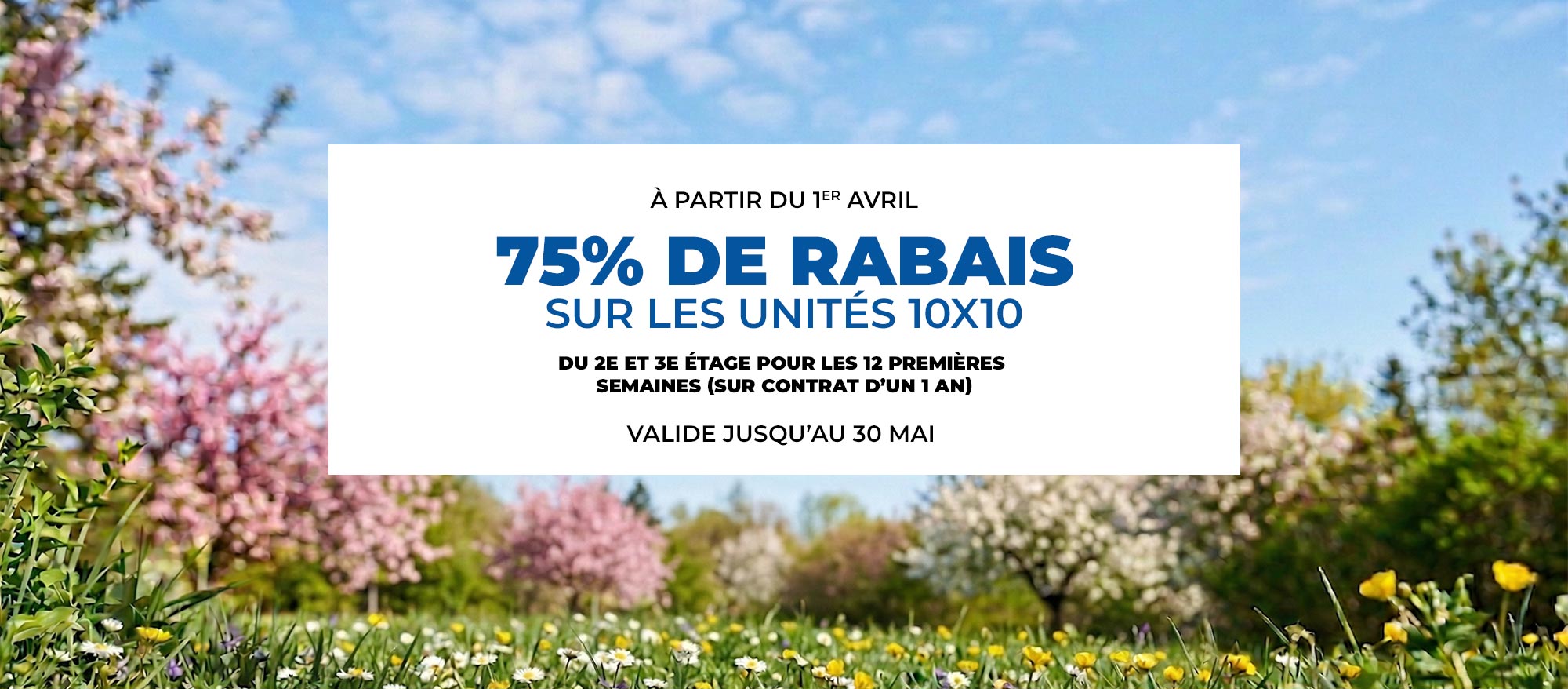 75% de rabais sur les unités 10×10 du 2e et 3e étage pour les 12 premières semaines (sur contrat d’un 1 an)